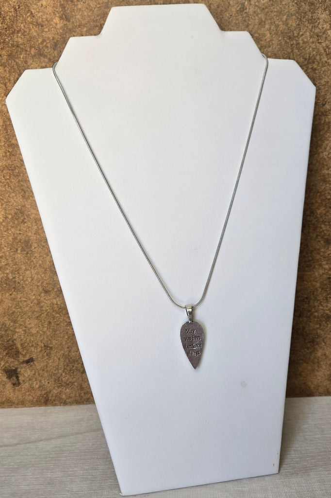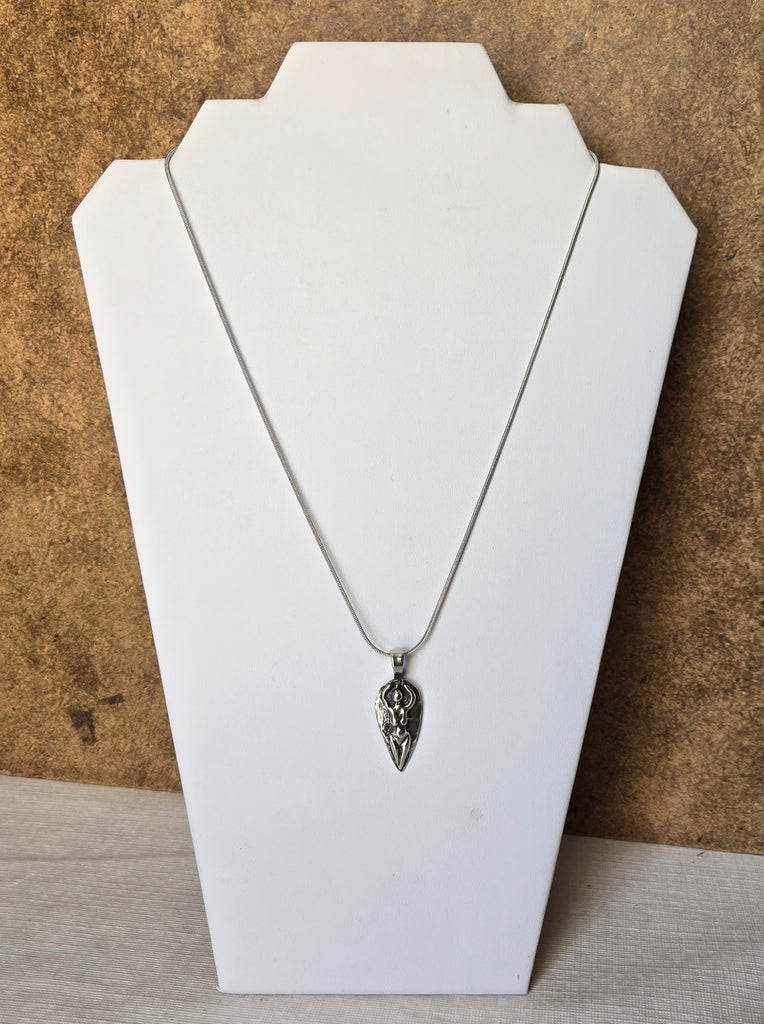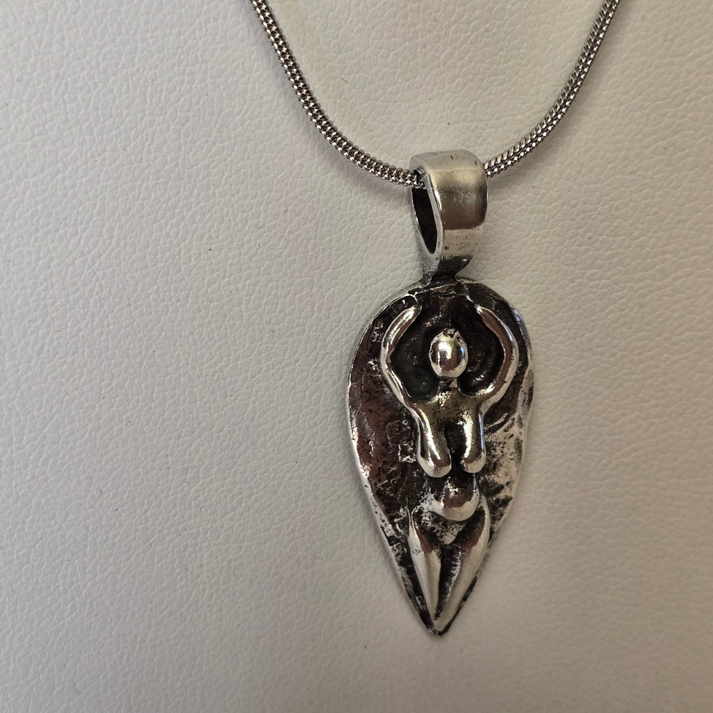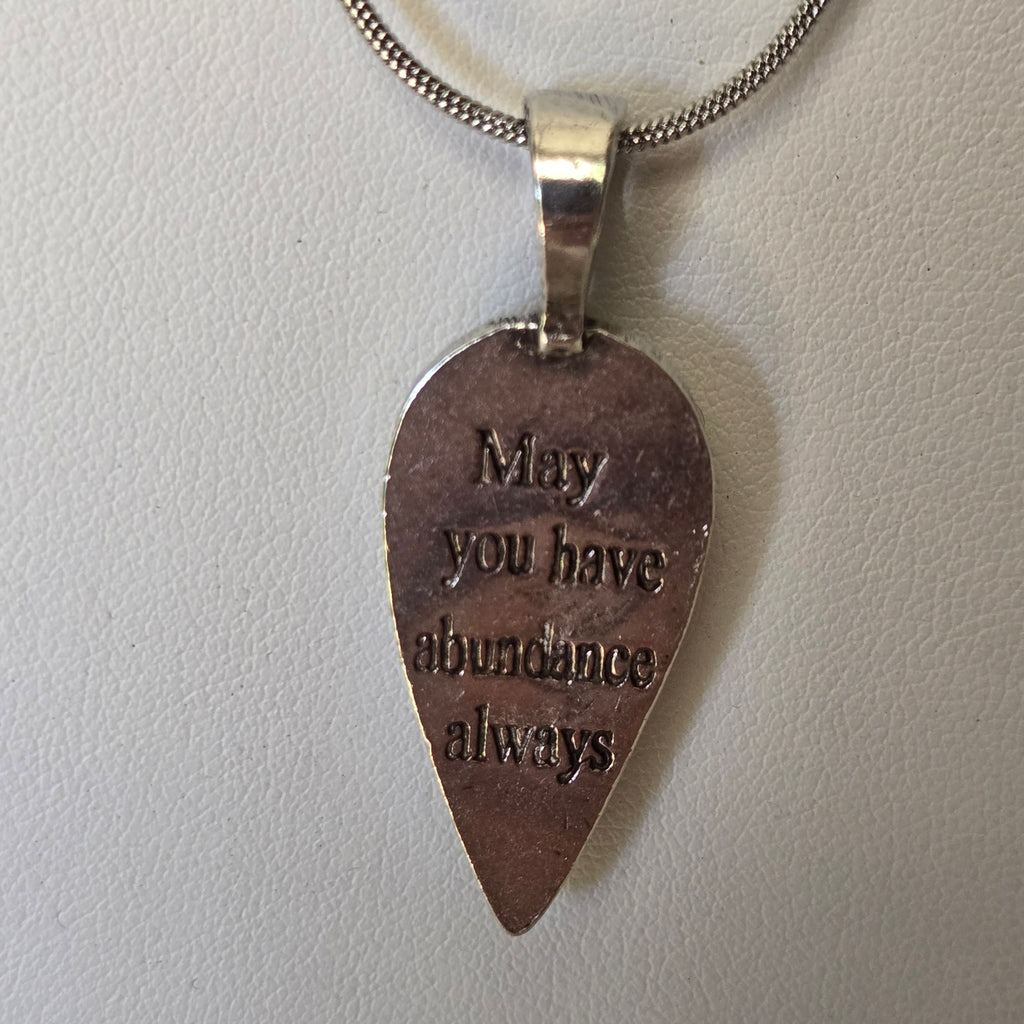 A beautiful pendant in an inspirational goddess design, measuring approximately 3/4" long, and hung on an 18" Stainless Steel snake chain ready for wearing. Reverse-side inscription: "May you have abundance always."