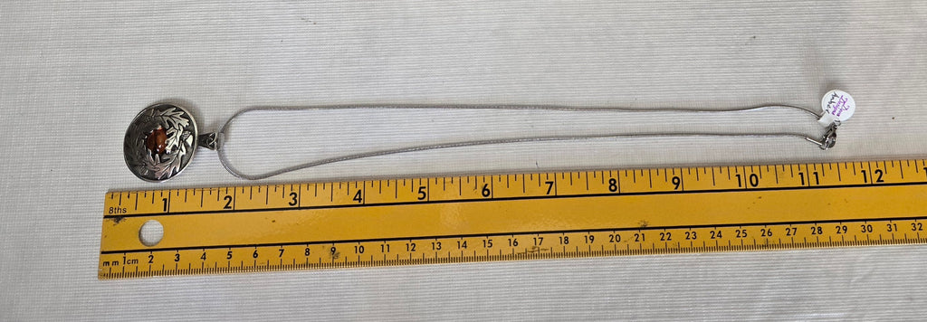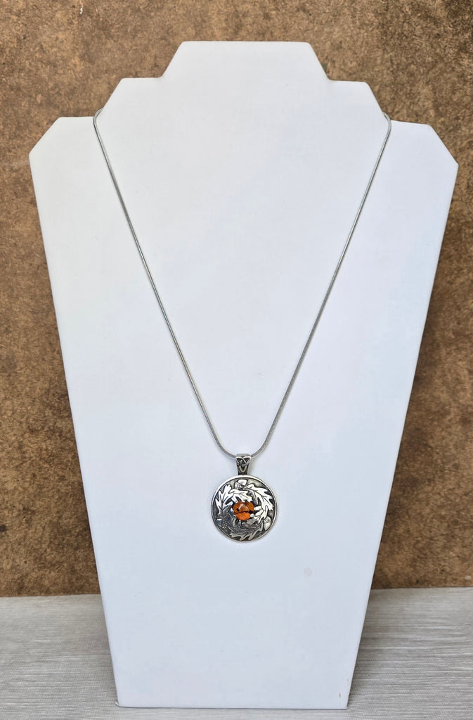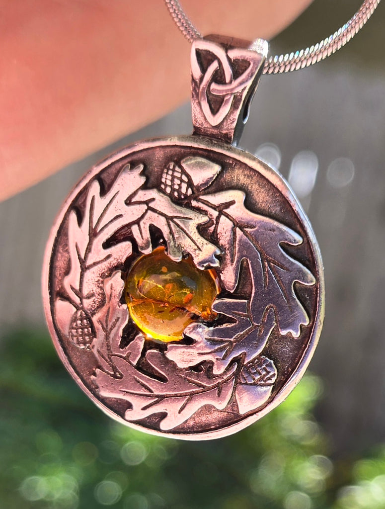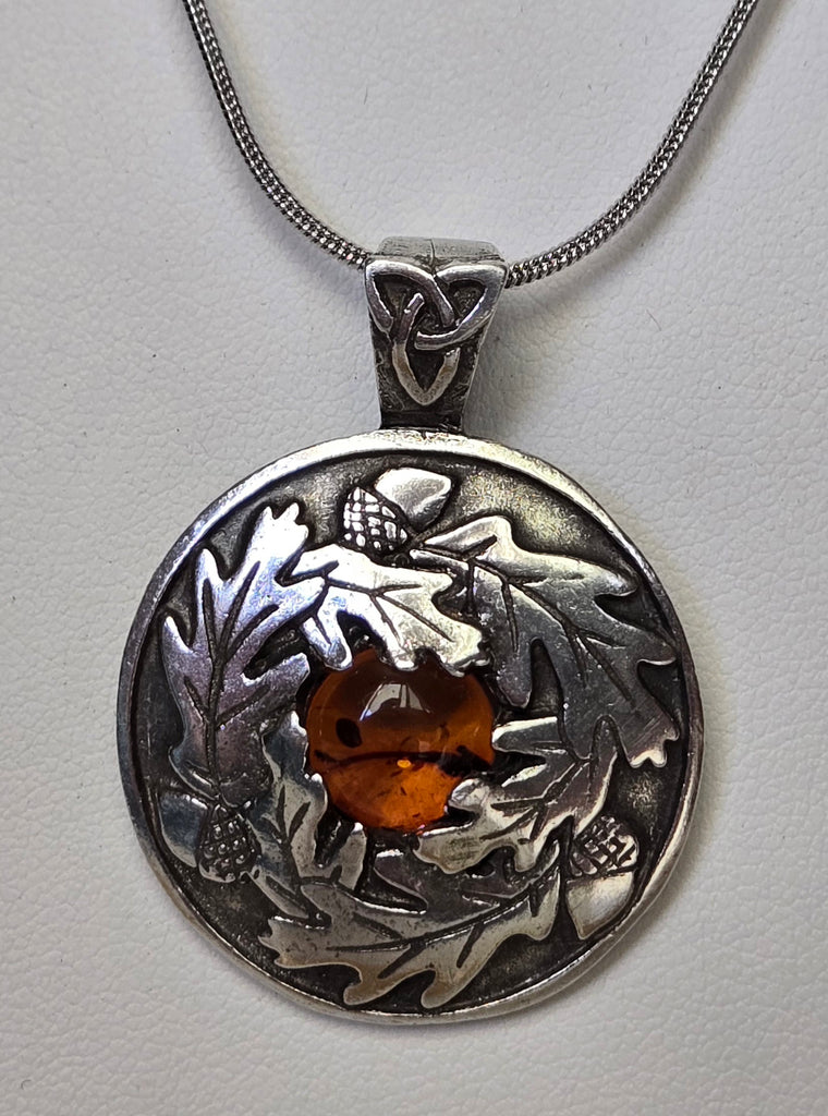 This Abundance Pendant features Oak leaves and Acorns with an Amber cab. Back Inscription: Abundance to This Person.