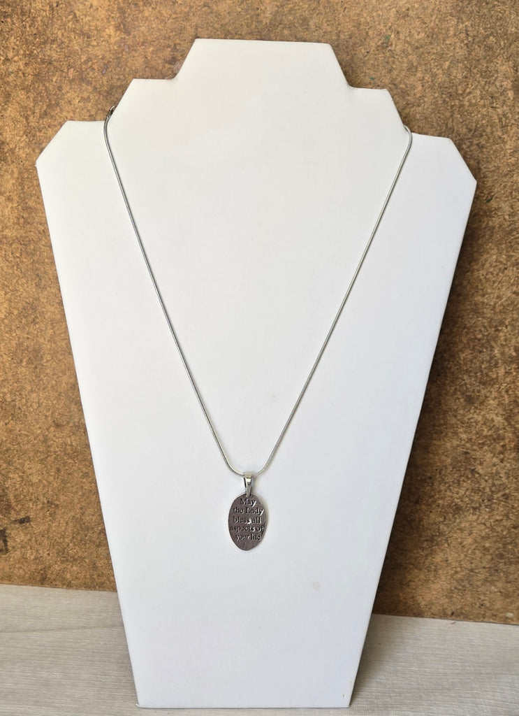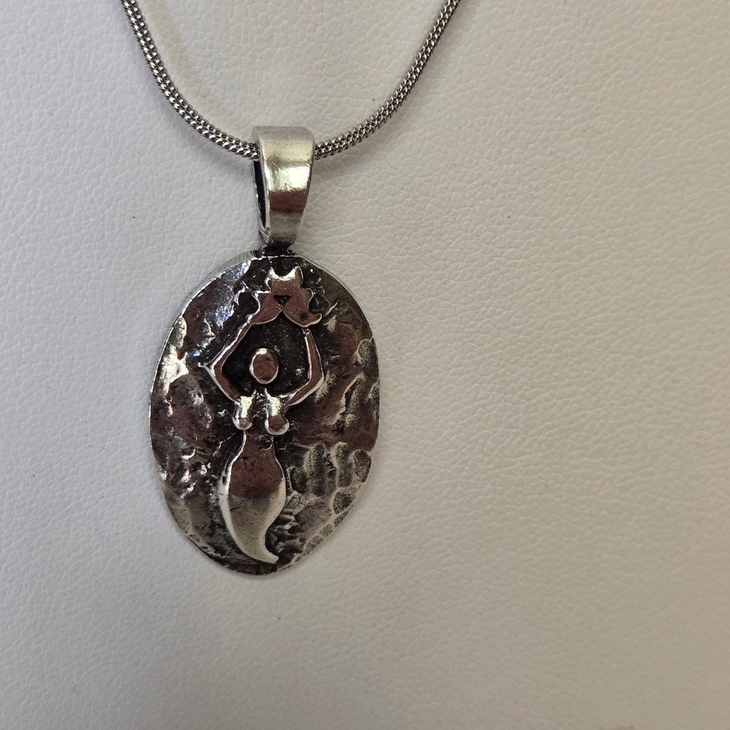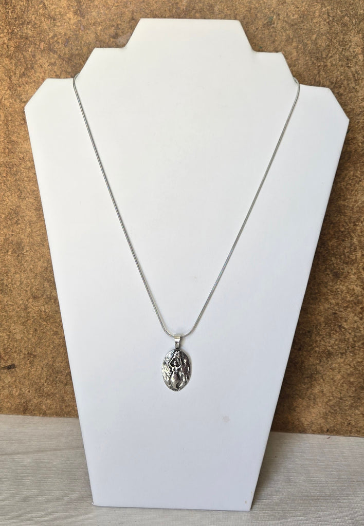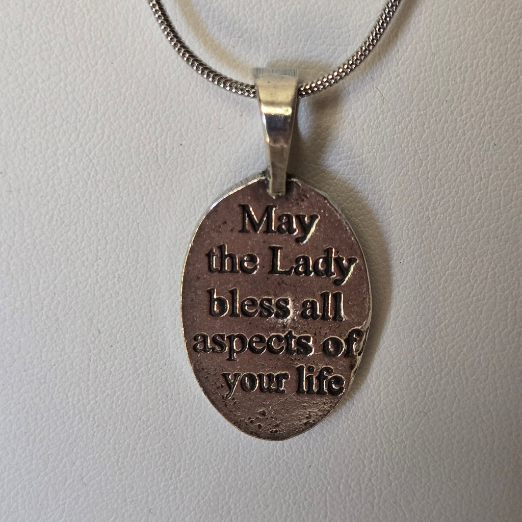 A beautiful pendant in an inspirational goddess design, measuring approximately 3/4" and hung on an 18" Stainless Steel snake chain ready for wearing. Reverse-side inscription: "May The Lady Bless All Aspects of Your Life."